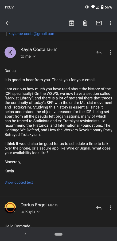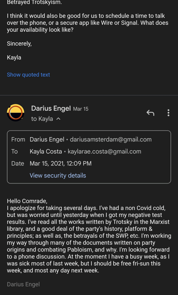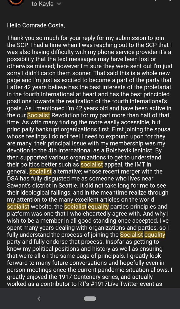 Hm, that’s strange. Do you mind sending me the whole thread? They must have had some secret discussion, which seems to have led to a decision against continued discussion. That’s a decision that should lead to an appeal, allowing you to represent your case in front of the committee who made the decision. If someone slandered you to the committee, how could you defend yourself without testifying or cross-examining other witnesses. The lack of any such rights to due process should lead to a wider discussion in the party about the procedure for carrying on discussions with new members. A party that does not want to include willing participants will only sabotage its own cause, no differently from the union bureaucracy that sabotages the labor movement. We should try to uncover the individual or individuals behind the slander and force them to defend the decision in public or reverse it!