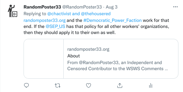 Shuvu has blocked messages from @randomposter33 and ignored comments to his website. This shows that despite the split, he remains loyal to the positions of the SEP Nanobureaucracy in favor of factional tyranny. And: