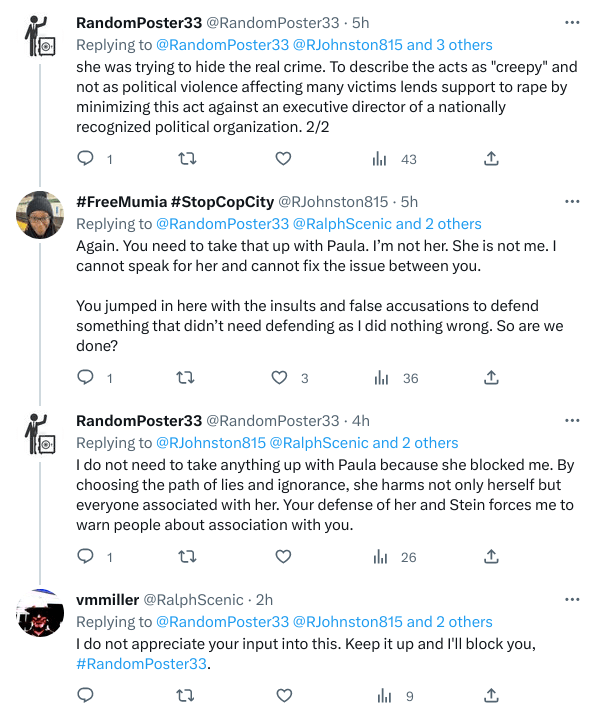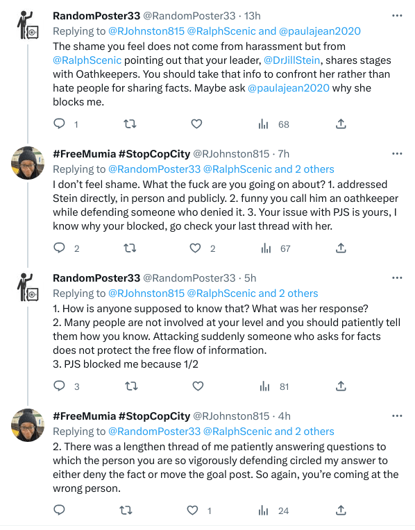 @RalphScenic pointed out in a facetious way that the Black Nationalists stand with the Oathkeepers and share the stage with them. Even if she went to Jill Stein, Stein just told her "get back to work," and Johnston took this as a legitimate point. @RalphScenic played the fool 1/2 pic.twitter.com/KOPH8nYsz4