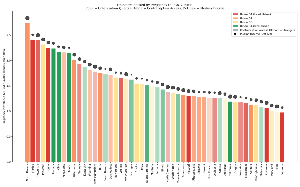 - Meaning: Urbanization raises LGBTQ visibility, but lower income and weaker contraception access keep pregnancy prevalence elevated.